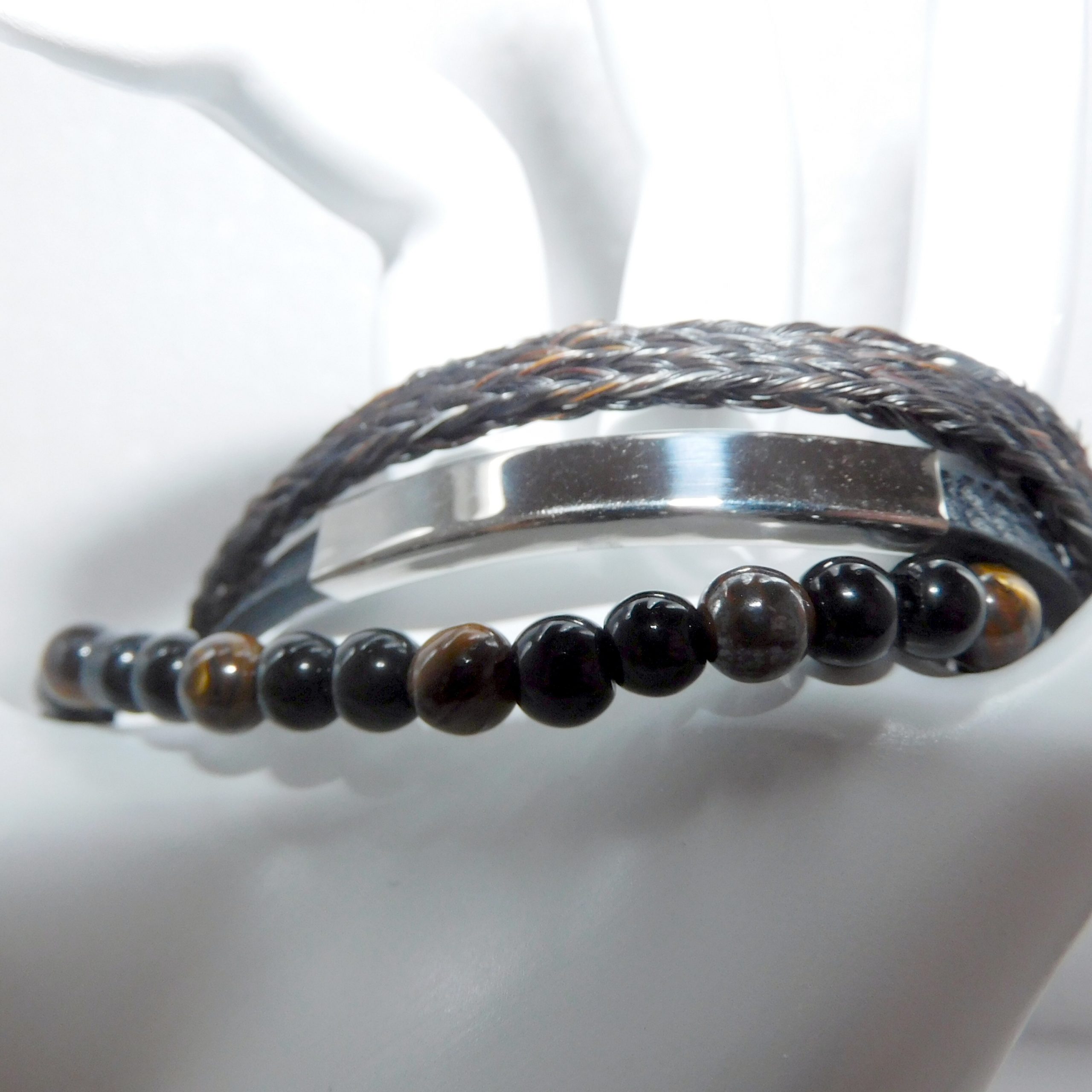 Unieke 3 delige armband van bruin paardenhaar, zwart leer en tijgeroog kralen