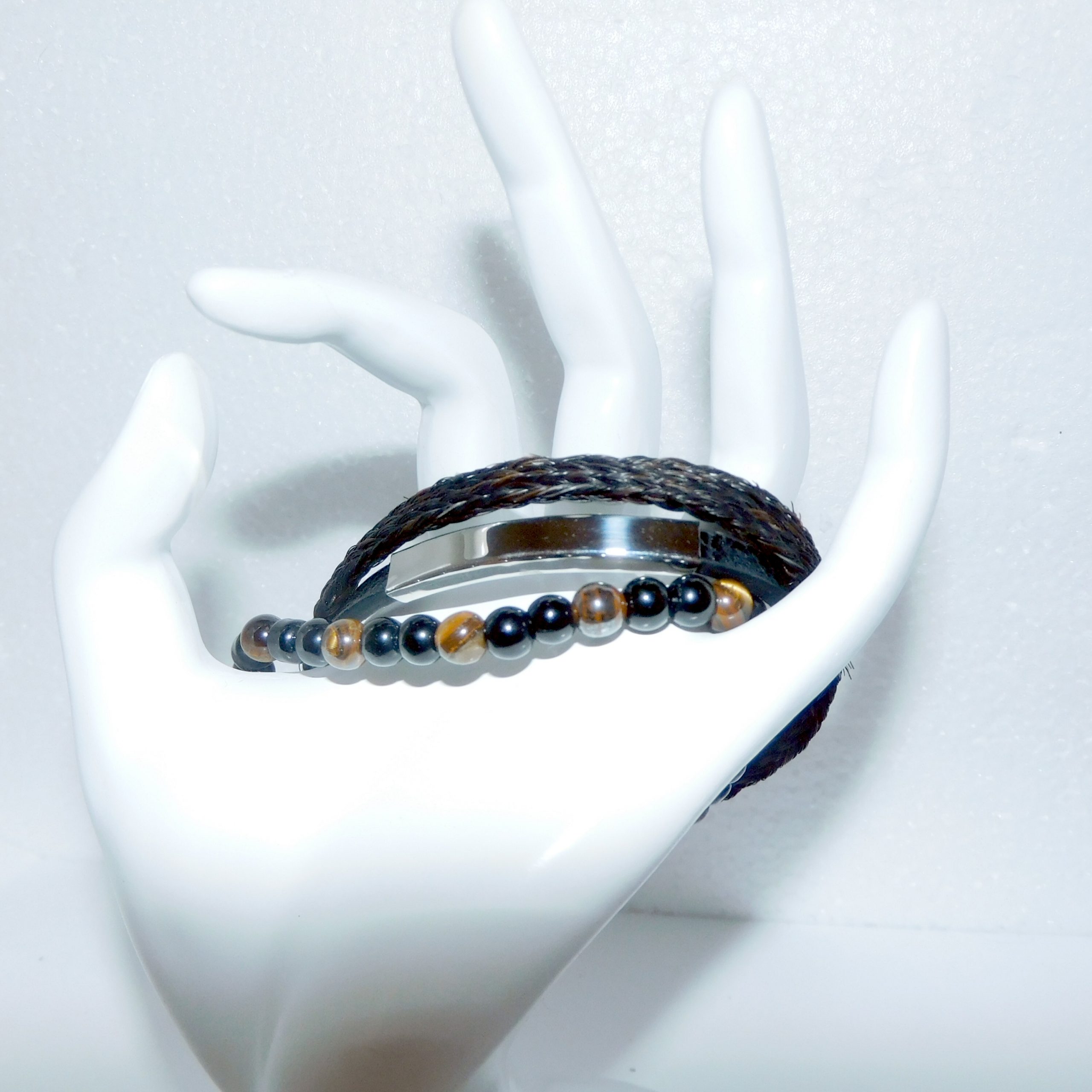 3 delige armband van paardenhaar – zwart leer – bruin paardenhaar- tijgeroog kralen – slider en magneetsluiting